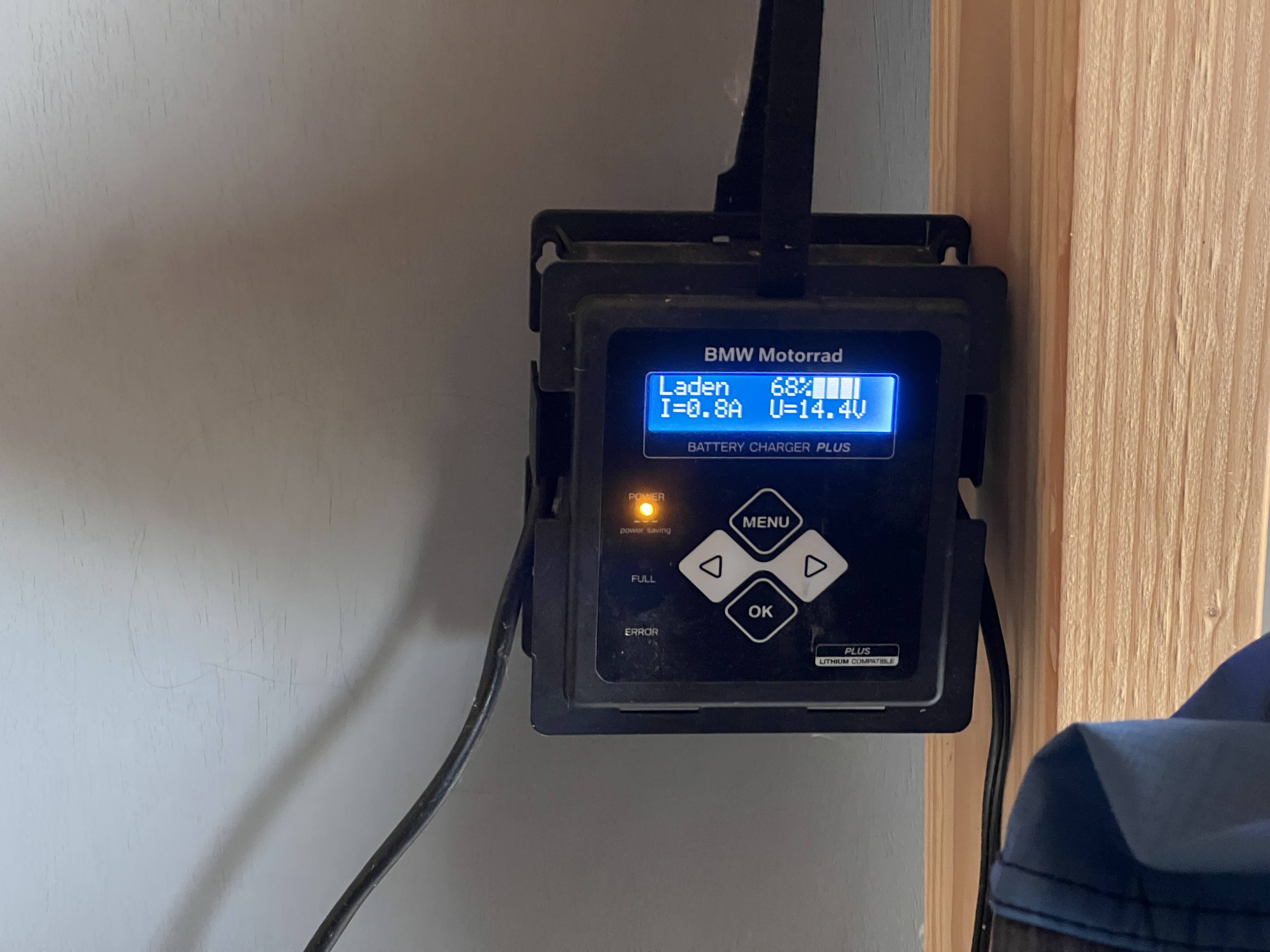 Motorrad eingewintert. Batterieladegerät angeschlossen und Abdeckung trotz Abstellraums