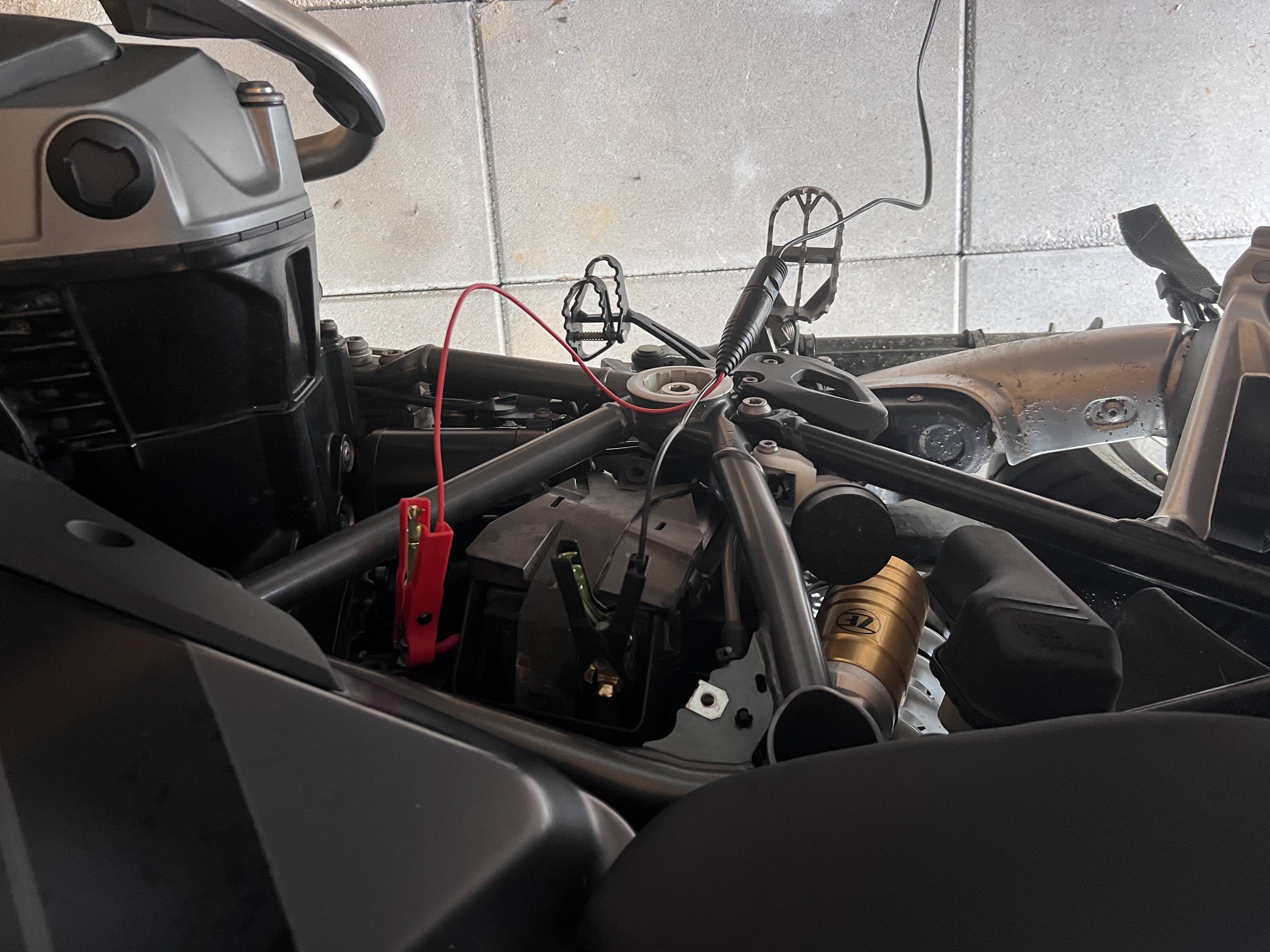Motorrad eingewintert. Batterieladegerät angeschlossen und Abdeckung trotz Abstellraums